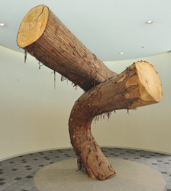 Located inside the entrance to the auditorium Vega Hall is a curiously bent giant cedar tree trunk, with another trunk lying across it, resting on a single point.
